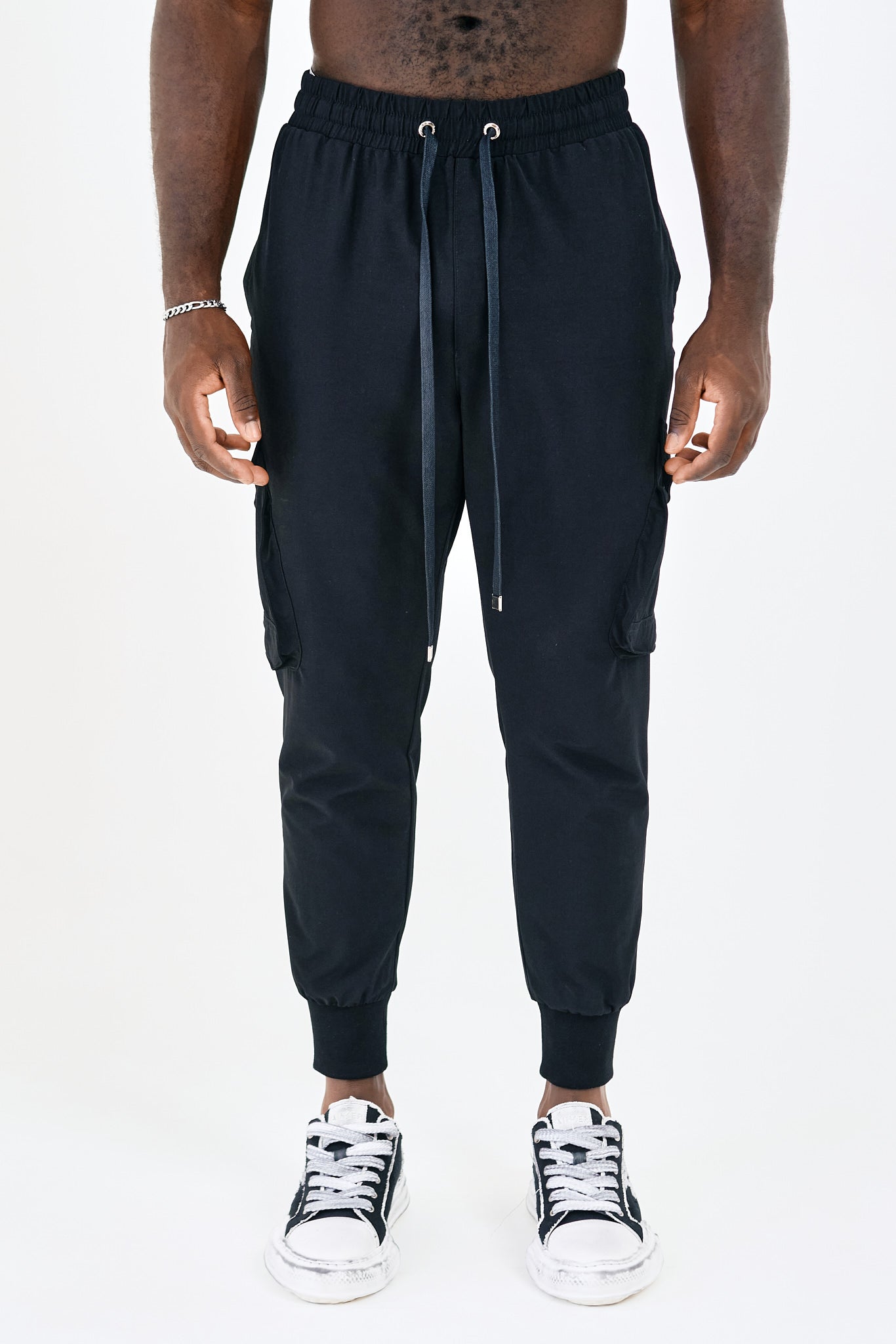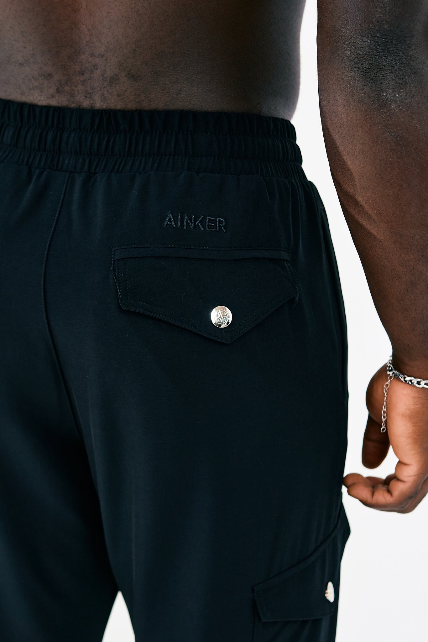 Long cargo pants by AINKER, 4 button pockets on the front. side and back,elasticated drawstring waistband finishes with tapered legs, availale in black.