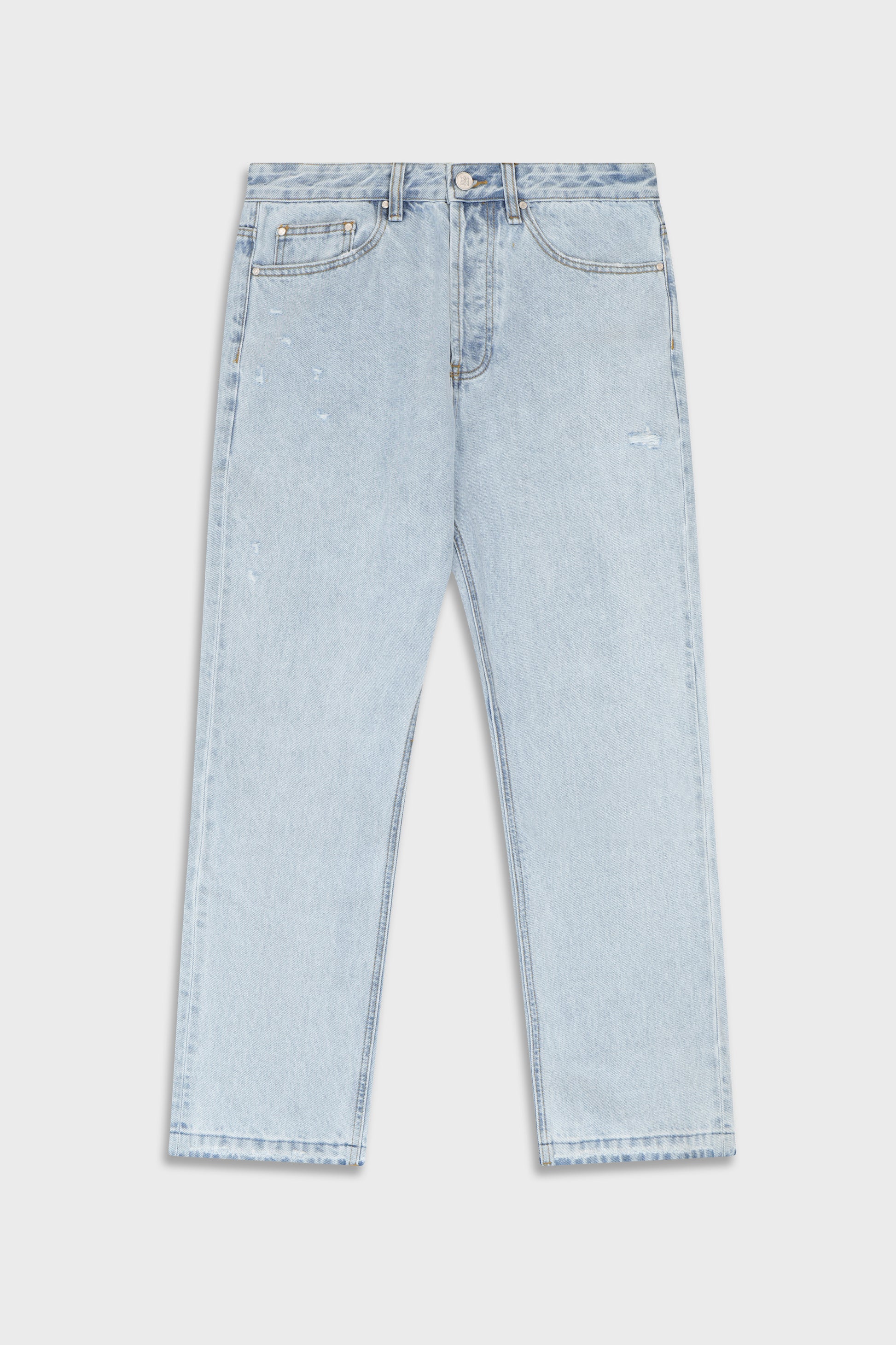 Regular straig fit, hand made tears on the front, leather brown logo on the back, arrives in sizes 29-36.