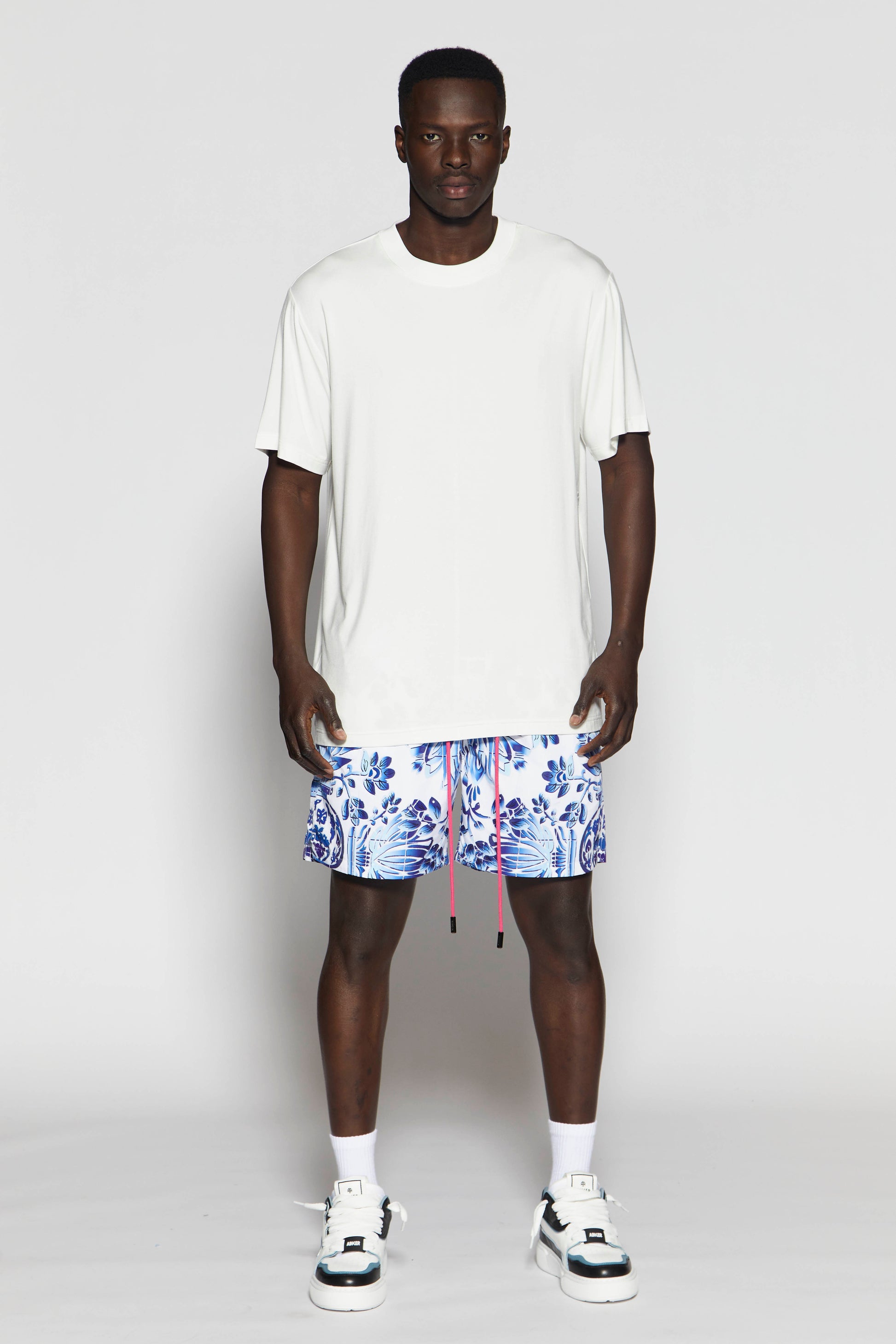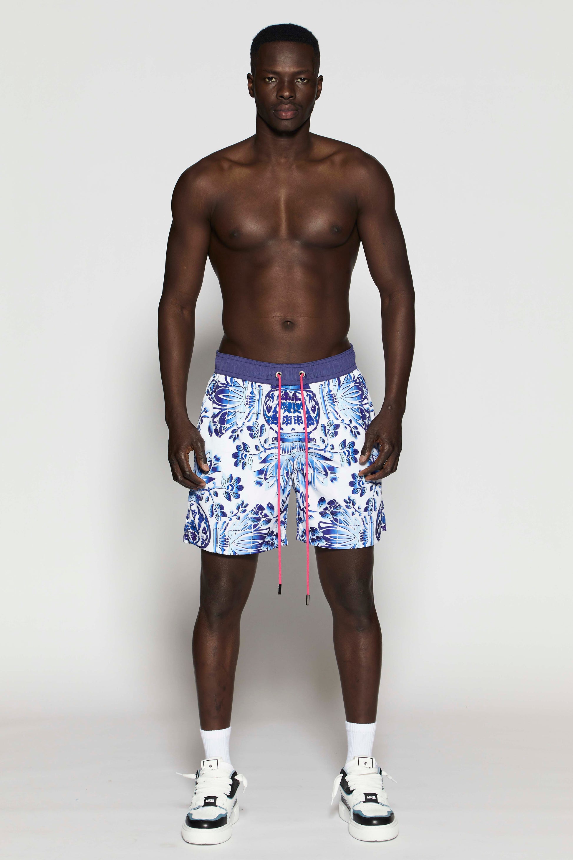 The model, standing at 186 cm, is wearing a size Large, highlighting the tailored yet relaxed silhouette. Complete with refined drawstrings and a soft elastic waistband, these swim shorts blend modern artistry with timeless luxury.