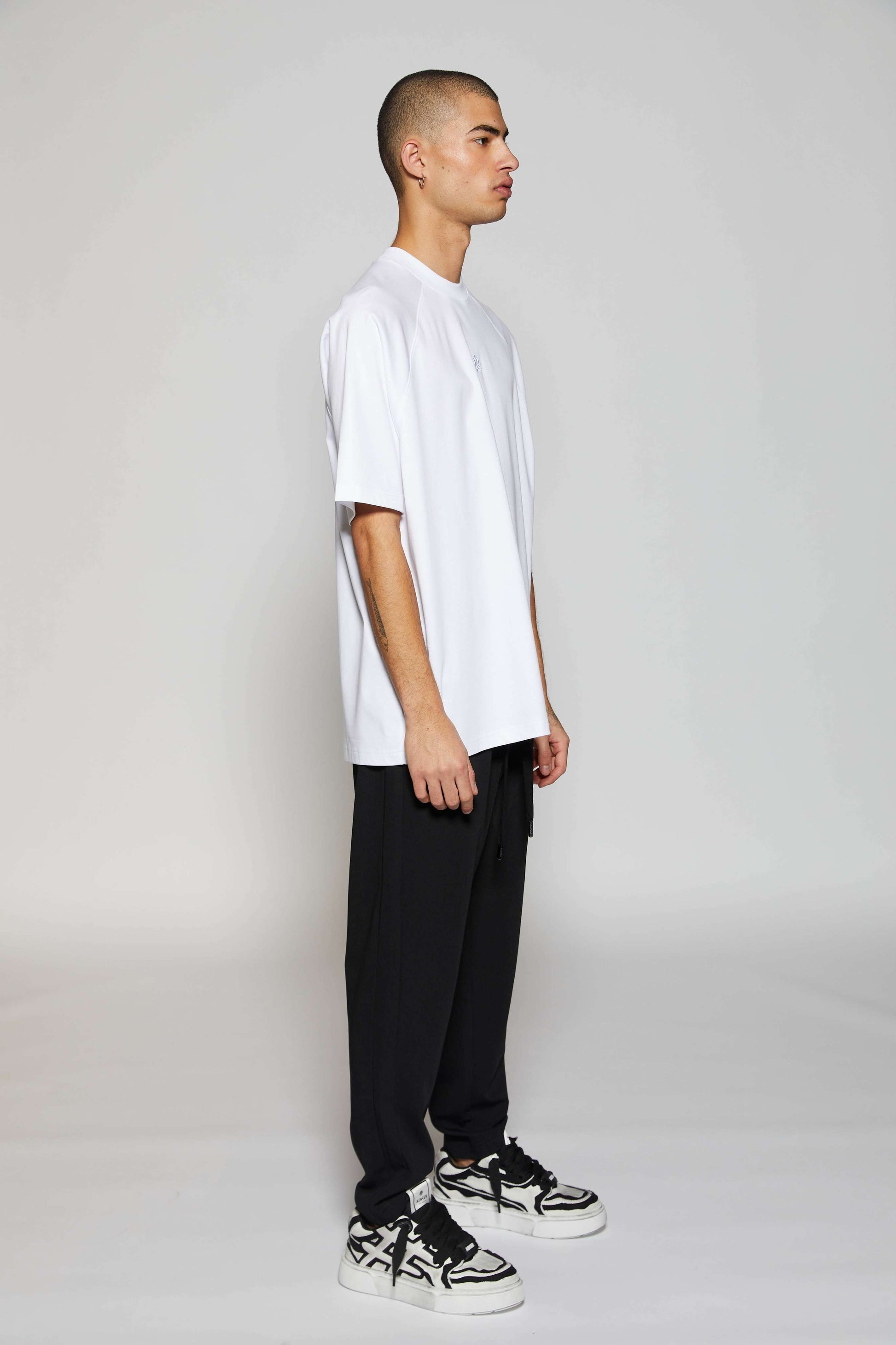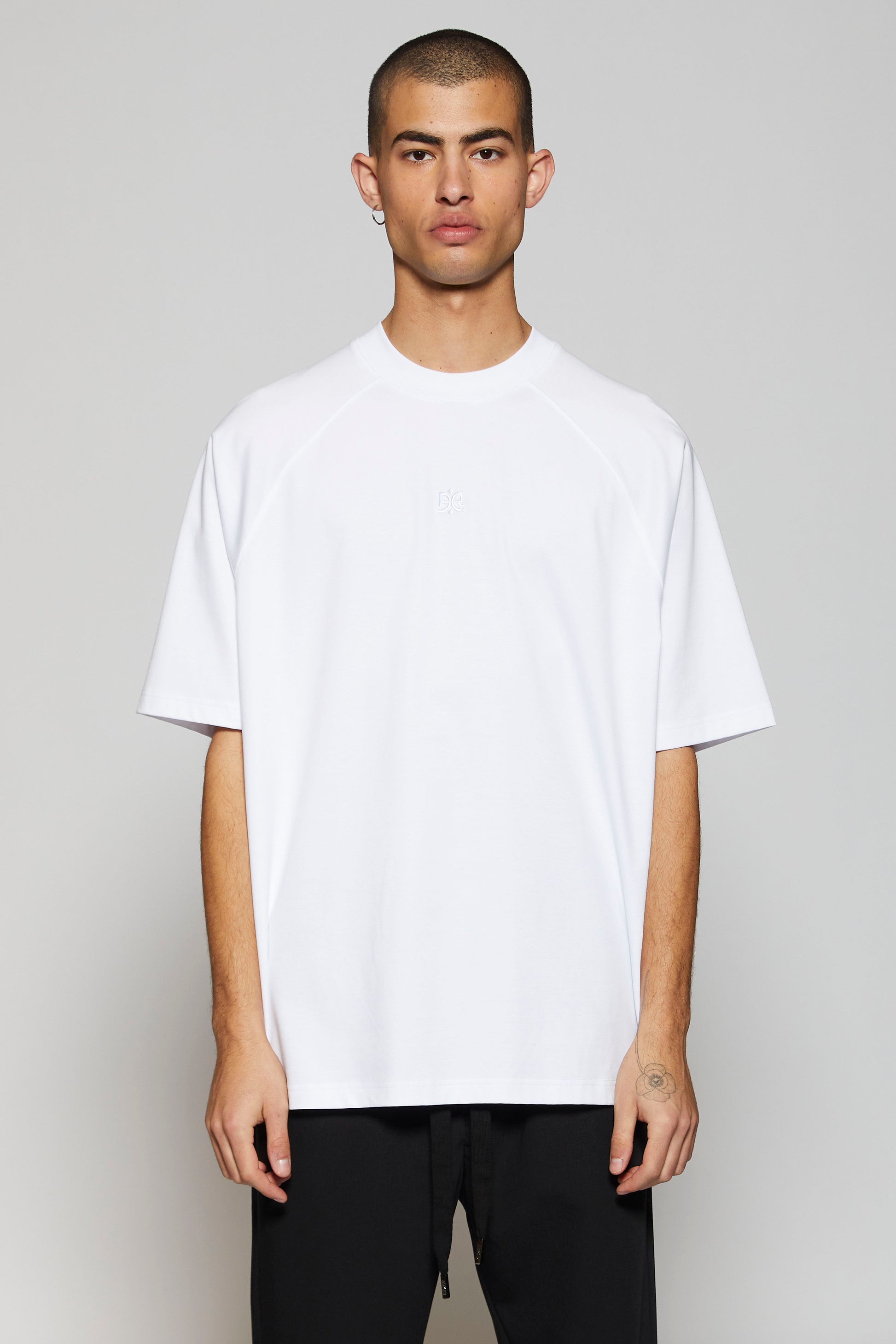 The minimalist tone-on-tone embroidery adds a subtle yet refined detail, embodying understated luxury. Designed for a relaxed silhouette, the model wears a size large at 1.86m, ensuring a perfect drape.
