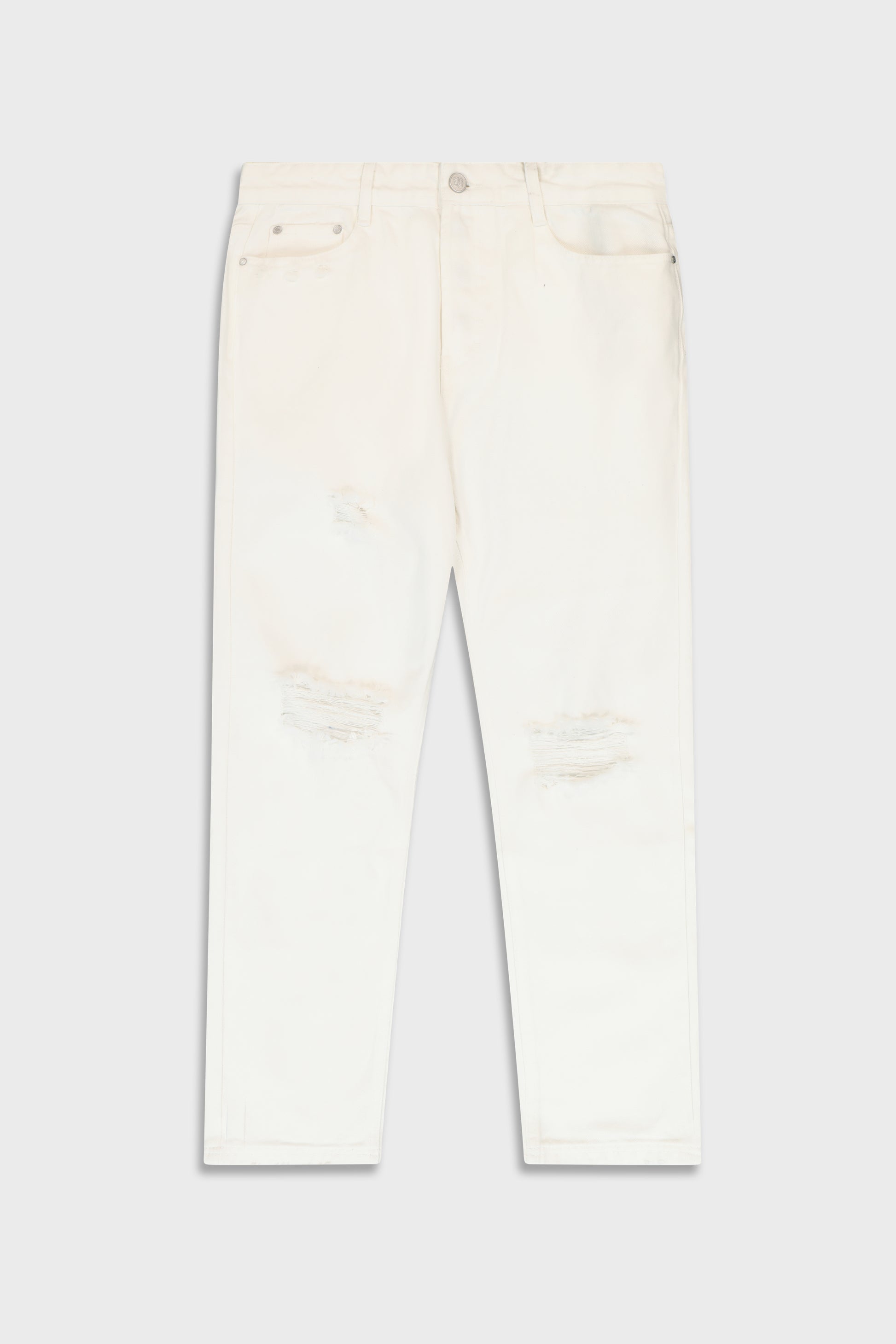 Regular fit, hand made tears on the front, leather brown logo on the back, arrives in sizes 29-36.